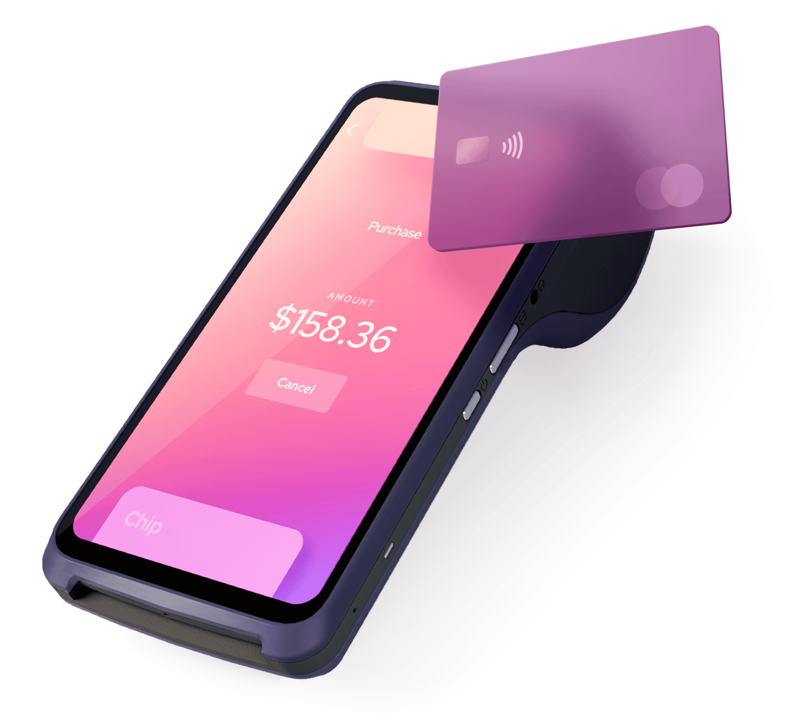 The Helcim Smart Terminal is a sleek handheld POS system that’s easy to set up and navigate. It has a large screen, a tap card reader at the top, a chip card reader at the bottom, and a receipt printer above the screen.
